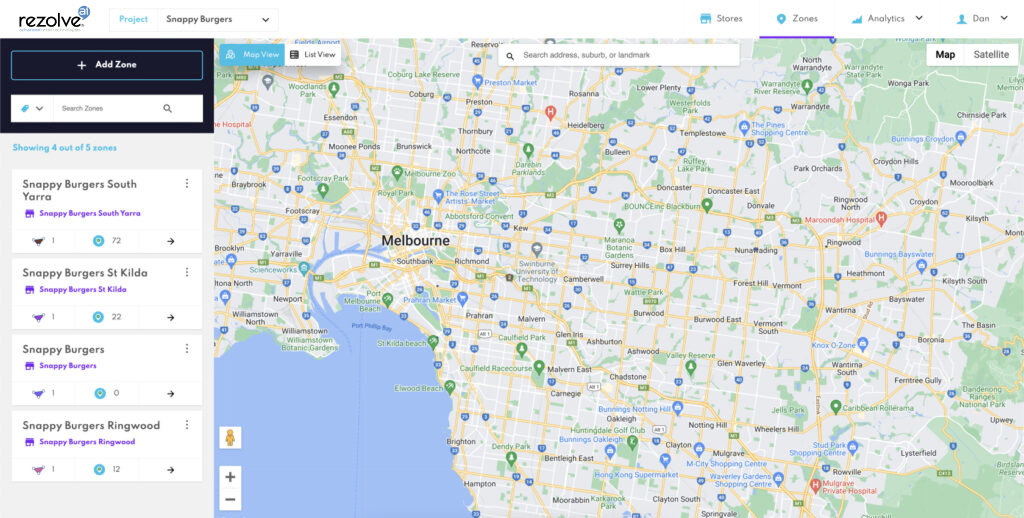 The Zone dashboard provides a simple, single map view for all your Zones and Geofences. From the dashboard, you can navigate between Projects, create new Zones, manage existing Zones, and generally navigate account.