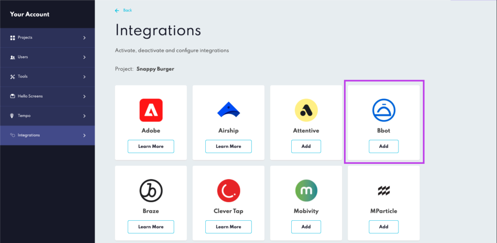- Obtain your Bbot API credentials from the Manage Partners section on Bbot’s dashboard.