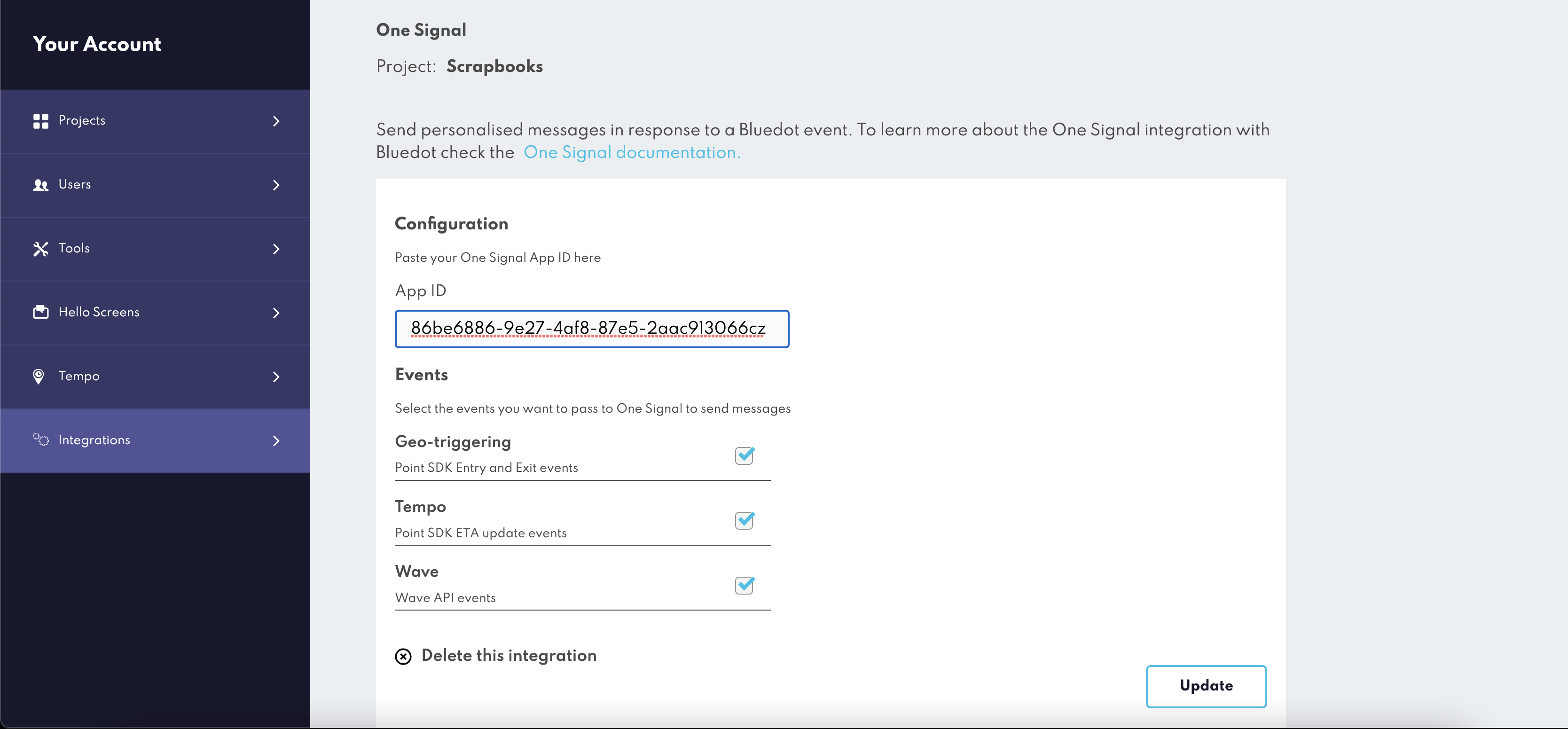 appIdvia the Integrations > OneSignal section in Canvas.Select the event types you would like to be passed to OneSignal and click ‘Add’.