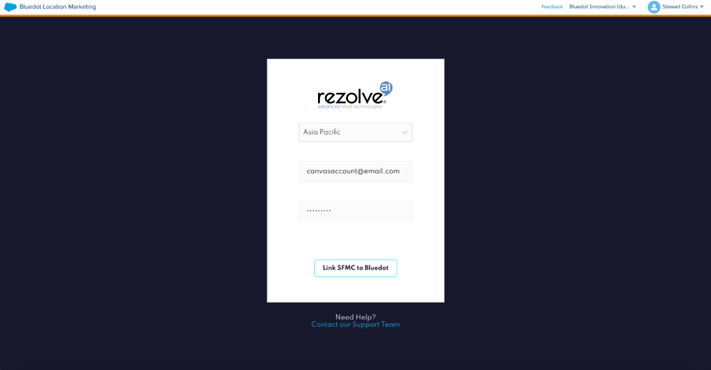 3. You will be redirected to the linking screen. Select your region (Asia Pacific, Europe or North America), input your Canvas user details and click Link SFMC to Bluedot.